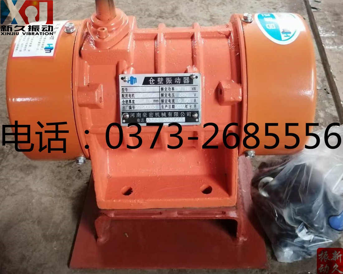 備注:XJF-4型系XJF系列倉壁振動器,激振力:0-2kN,轉速:3000r/min,功率:0.18kW,電壓:380v,電流:0.55A,是料倉、料罐、料斗、溜槽及輸送管道等設備的理想防閉塞裝置。